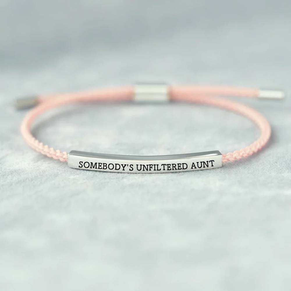Celebrate the no-filter, tell-it-like-it-is energy with the "Somebody's Unfiltered Aunt" tube bracelet. Featuring a sleek metal bar engraved with this cheeky phrase, this accessory is made for the aunt who’s always authentic, a little wild, and endlessly fun.